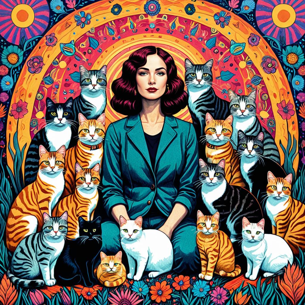 A couple surrounded by an unreasonable amount of fluffy cats, in vivid psychedelic colors. Inspired by Arthur Frank Mathews, Alisa Burke, Anna Silivonchik, and Bill Bell.