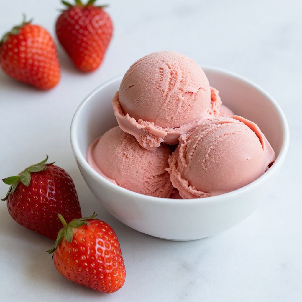 Photograph of two creamy vanilla ice cream scoops on a white plate, sprinkled with red strawberry powder. A fresh, halved strawberry with green leaves rests beside the ice cream. In the background, a white bowl filled with whole strawberries is slightly blurred. The plate and bowl are set on a clean, white surface, creating a bright and fresh composition. The ice cream has a smooth texture, contrasting with the juicy, textured strawberry.