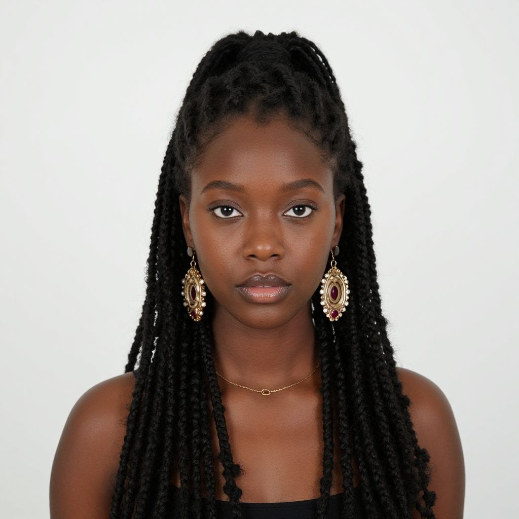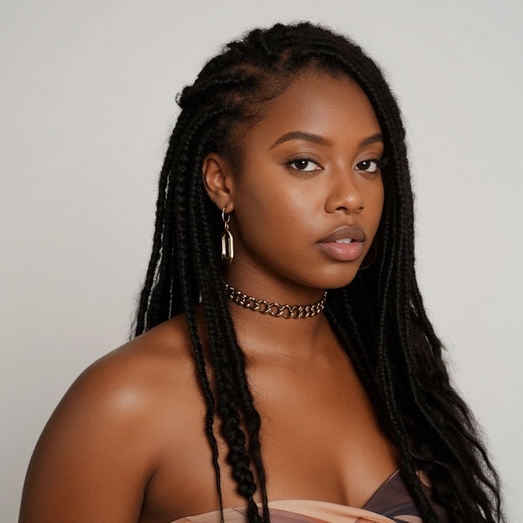 "hair plaiting style woman, 1girl, solo, dark skin, dark-skinned female, very dark skin, earrings, jewelry, realistic, lips, black hair, bare shoulders, breasts, nose, dreadlocks, dress, choker Realistic photo of casual sexy person with pretty face"