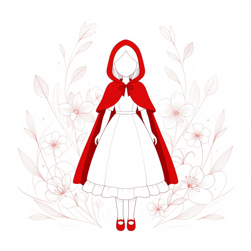 Digital illustration of Little Red Riding Hood in a white dress and red hooded cape, standing centered against a white background with red floral sketches.