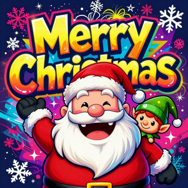 Detailed colored new year oil drawing in style of Christmas greeting card, absorbent paint impression, girl with little fluffy bunny, smiles, light spots, snowflakes fall from the sky, shimmer, sparkle, christmas tree, glow, pearls, at image top text: \"Merry Christmas\", kodak professional photoshoot, 50mm lens, vivid colors