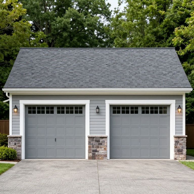 Two garage doors with classic carriage-style design and frosted glass windows are symmetrically positioned beneath a dark gray shingled roof, flanked by stone accents and outdoor wall sconces, set against a backdrop of lush green trees and a paved driveway.