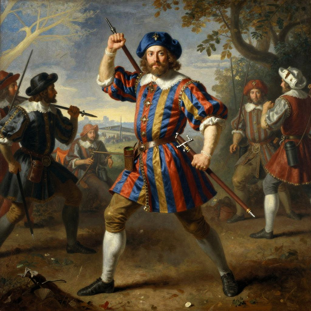 Detailed landsknecht painting portraying a group of mercenaries in flamboyant attire, lively colors, complex armor details, renaissance realism, dynamic composition with smoke and fire in background
