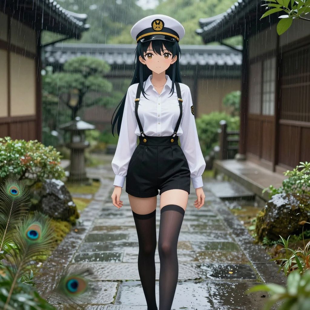 Digital anime-style illustration of a young woman with long black hair and brown eyes, wearing a white naval officer's hat, white button-up shirt, black high-waisted shorts, and black thigh-high socks. She stands in a traditional Japanese courtyard during a rainy day, with wet stone paths and traditional wooden buildings in the background. The foreground includes peacock feathers. The woman's expression is neutral, and her posture is straight. The overall color palette includes whites, blacks, greens, and browns, with a soft, misty atmosphere.