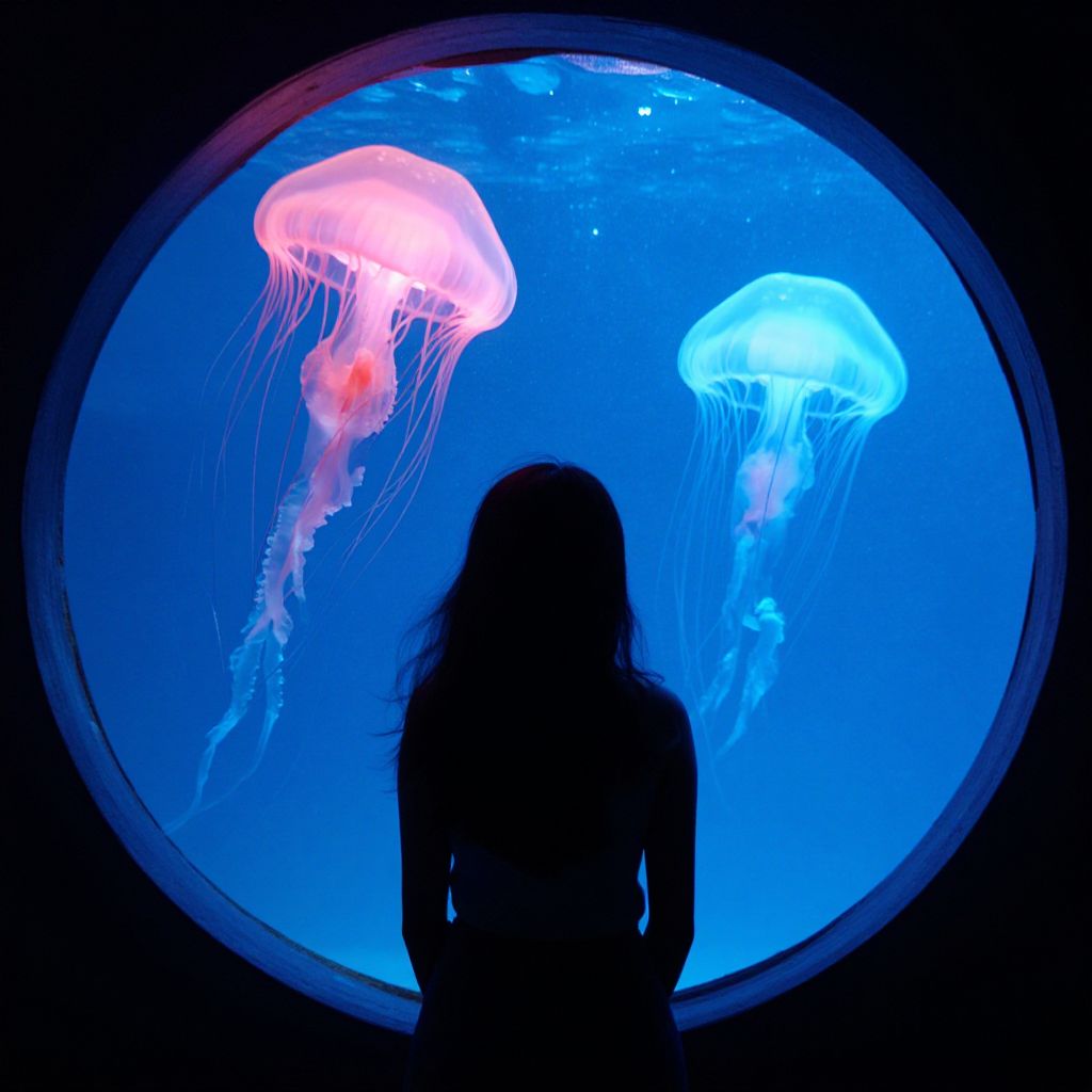 Silhouetted against a vibrant underwater scene, a woman gazes through a circular porthole at two ethereal jellyfish—one glowing in radiant pink hues with cascading tendrils, the other shimmering in soft blue tones, both suspended gracefully within a mesmerizing aquatic environment dotted with floating particles.
