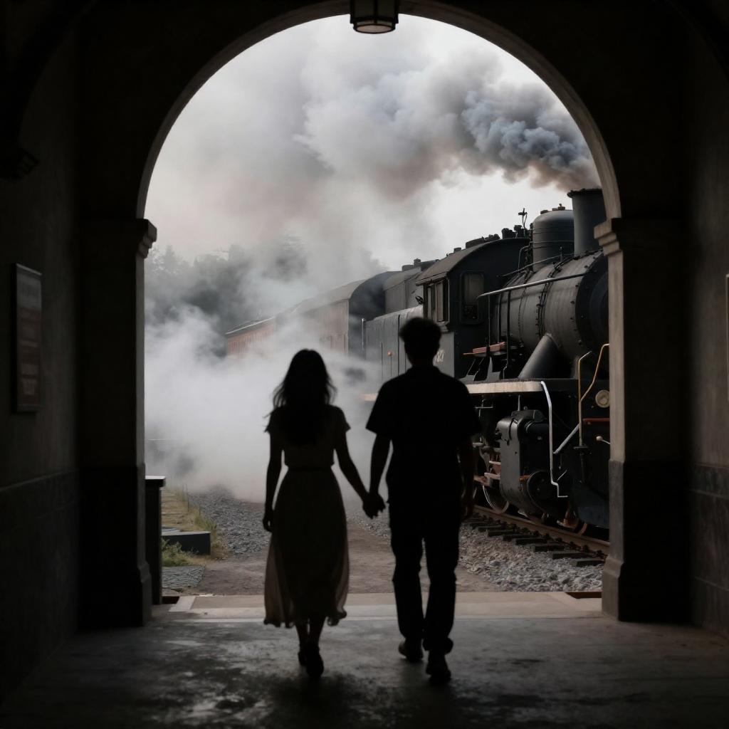 Silhouetted couple holding hands, woman in long dress, man in pants, walking through dark archway toward steam train. Train emits thick white smoke, number 75087 visible. Train on right, couple in center. Dimly lit, shadowy atmosphere.