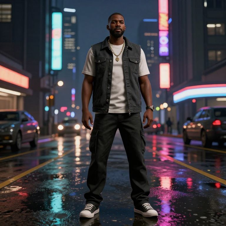 Confident Black GTA Character at Night