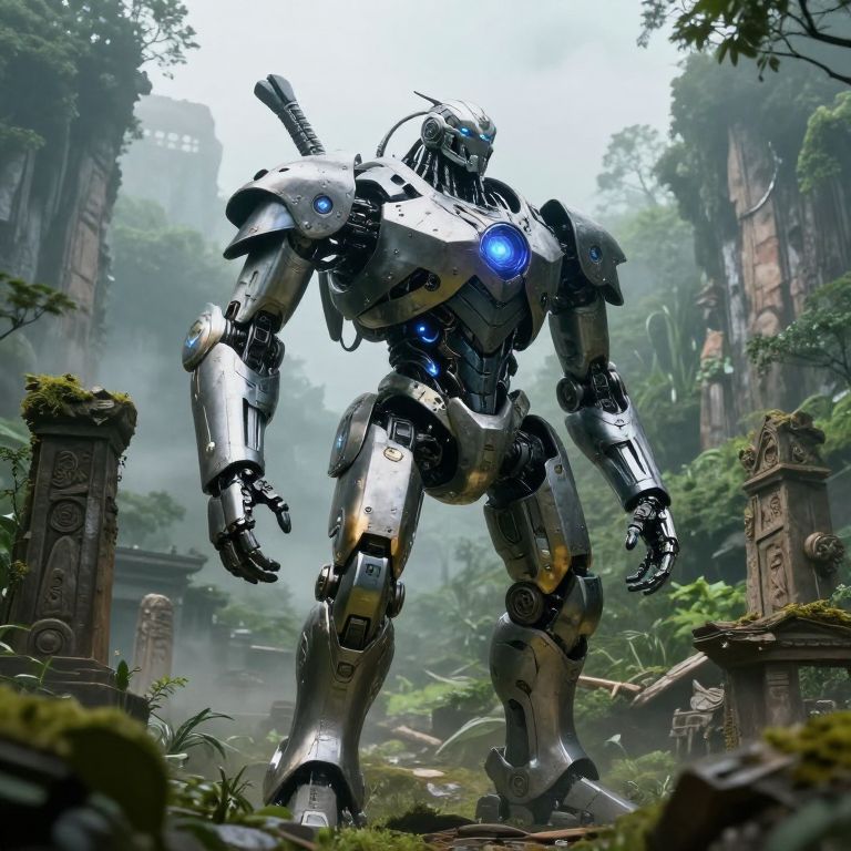 Photorealistic digital artwork depicting a towering, humanoid silver robot with glowing blue eyes and chest light, standing amidst a lush, misty jungle. The robot has intricate, armor-like plating with visible mechanical joints and a sword-like appendage on its back. Surrounding the robot are ancient, moss-covered stone pillars and ruins, partially obscured by dense foliage. The background features tall, mist-shrouded trees and a faint, overcast sky, creating a mysterious, otherworldly atmosphere. The robot's metallic surface contrasts with the natural greenery, emphasizing its futuristic, mechanical nature.