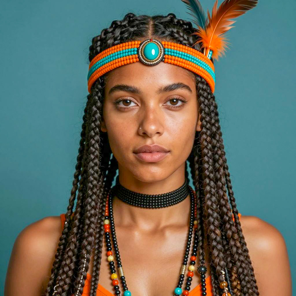 Photograph of a woman with curly dark hair in a high bun, teal earrings with tassels, and a colorful patterned top with ruffles. Her top is open, revealing cleavage. She wears a detailed turquoise and orange necklace. Her expression is neutral. Background is a solid teal color. She has light skin, brown eyes, and full lips. She is centered and looking directly at the camera.
