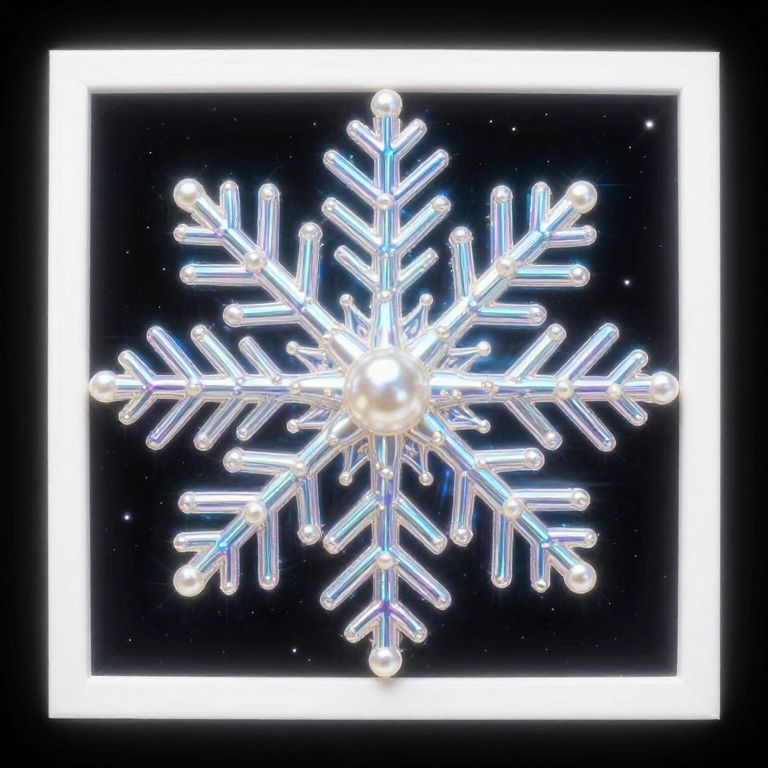 The image showcases a highly detailed, iridescent snowflake design framed within a symmetrical, hyperreal composition. The snowflake, with its intricate, holographic textures and pearl-like sheen, is the central focus, radiating vibrant, glowing surreal lighting that creates a cinematic effect. The design is set against a dark, starry background, enhancing the luminosity and depth of the snowflake. The frame is meticulously crafted, with a black outer border and a white inner border, adding to the overall symmetry and balance of the composition. The dynamic composition, with the snowflake positioned centrally and the lighting effects extending outward, draws the viewer's eye into the image, creating a sense of depth and immersion. The overall aesthetic is reminiscent of fantasy art, with elements that evoke a sense of wonder and enchantment.