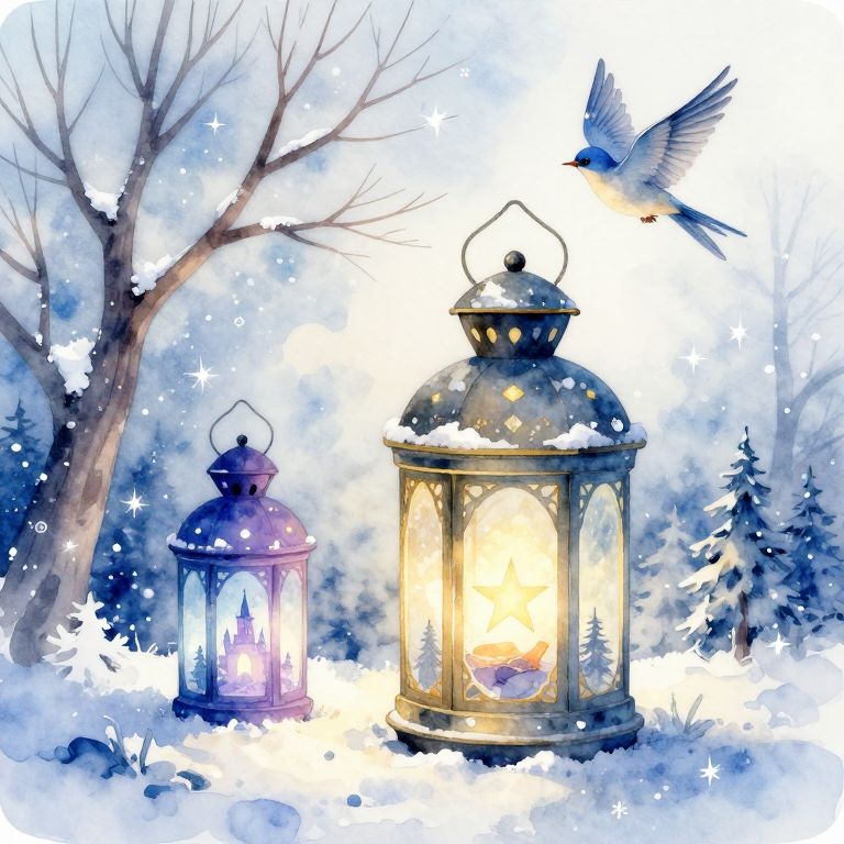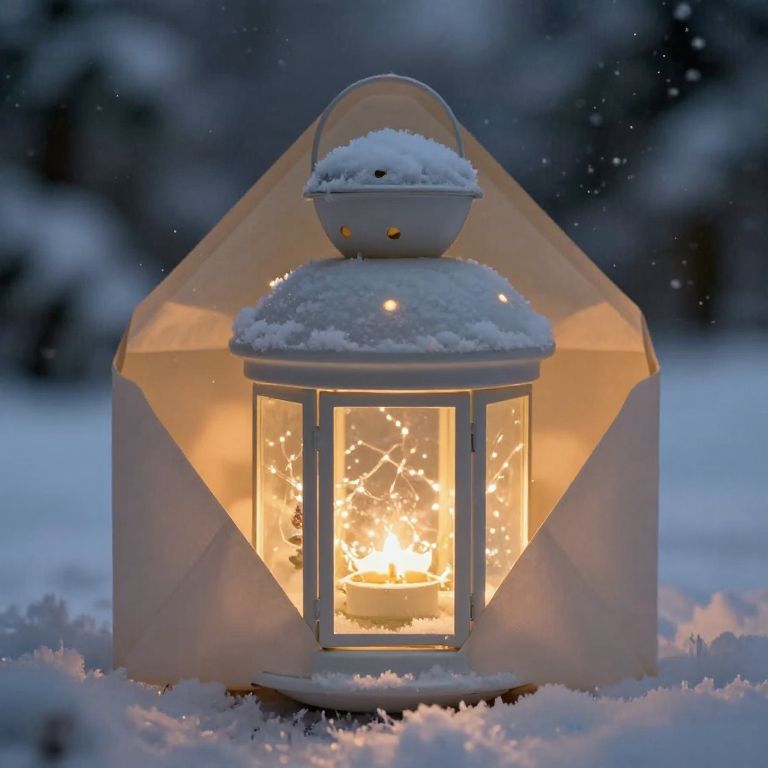 Enveloped in the gentle embrace of winter, a whimsical lantern cradles a miniature world of serenity and wonder, where the soft glow of Christmas lights dances with the quiet whispers of snow, evoking a timeless sense of magic and nostalgia.