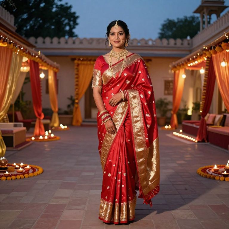 A full-body shot of a bride in a vibrant red and gold banarasi saree, her face adorned with a light gold bangle and a subtle makeup, dressed for a festive wedding ceremony in a heritage-style courtyard with diyas and silk tents glowing under the evening sky.
