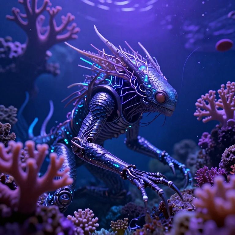 Envision an underwater tableau, evoking the captivating fusion of biomechanical artistry and mesmerizing deep-sea cinematography. From a close perspective, witness an enigmatic aquatic entity with scales mirroring intricate metal armor, adorned by bioluminescent vines that mimic electrical circuitry. This creature is nestled within a vibrant coral forest, bathed in hues of purple and blue as if it inhabits a unique alien ecosystem. The ethereal encounter elicits a profound emotional response, transporting the viewer into an enchanting realm where nature and technology harmoniously converge, leaving them both captivated and deeply immersed in its enigmatic allure.