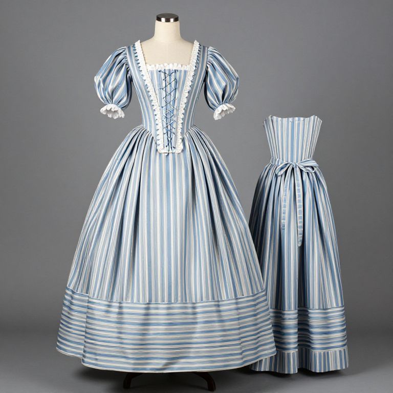 Georgian Polonaise Dress displayed on a mannequin, showcasing a raw silk fabric in blue and cream stripes, featuring an overdress with puff sleeves, a fitted bodice with front lacing, and a matching stomacher, complemented by a top-petticoat tied with ribbons at the waist, all inspired by historical designs from the Victoria & Albert Museum in London and crafted following Janet Arnold's Patterns of Fashion book.