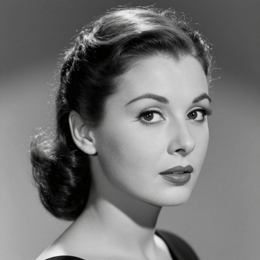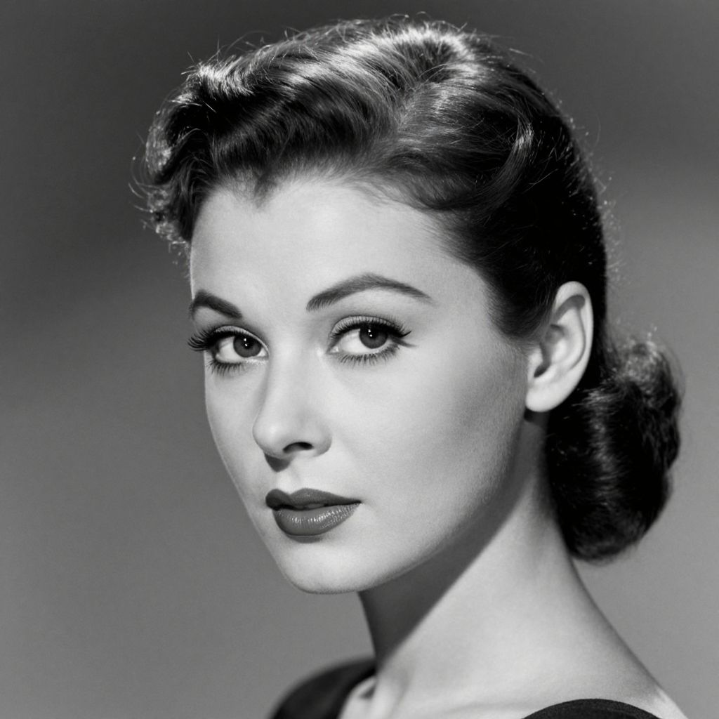 A classic black-and-white portrait featuring a woman with elegantly styled hair, captured in a vintage cinematic style reminiscent of mid-20th century Hollywood glamour, rendered with high-definition detail and dramatic lighting to emphasize her timeless beauty.