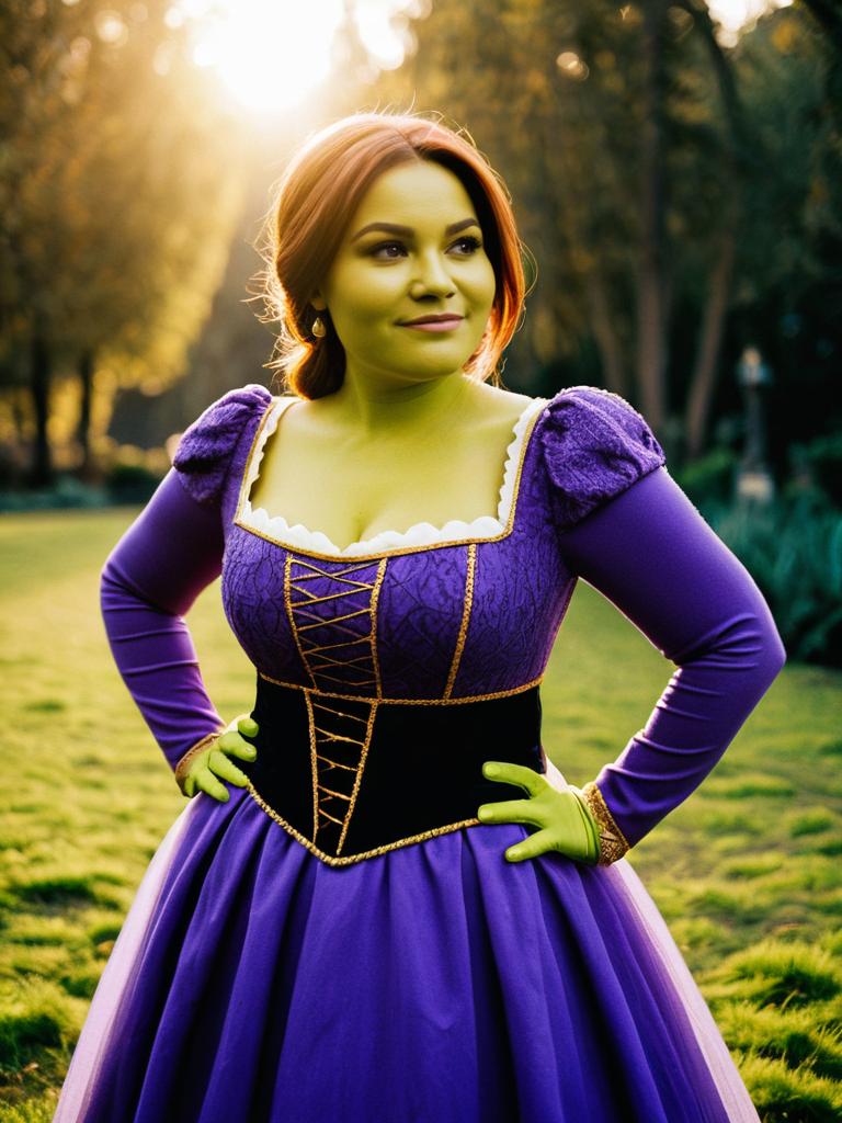 Woman in Purple Dress Shrek costume, outdoor cosplay photo, golden hour