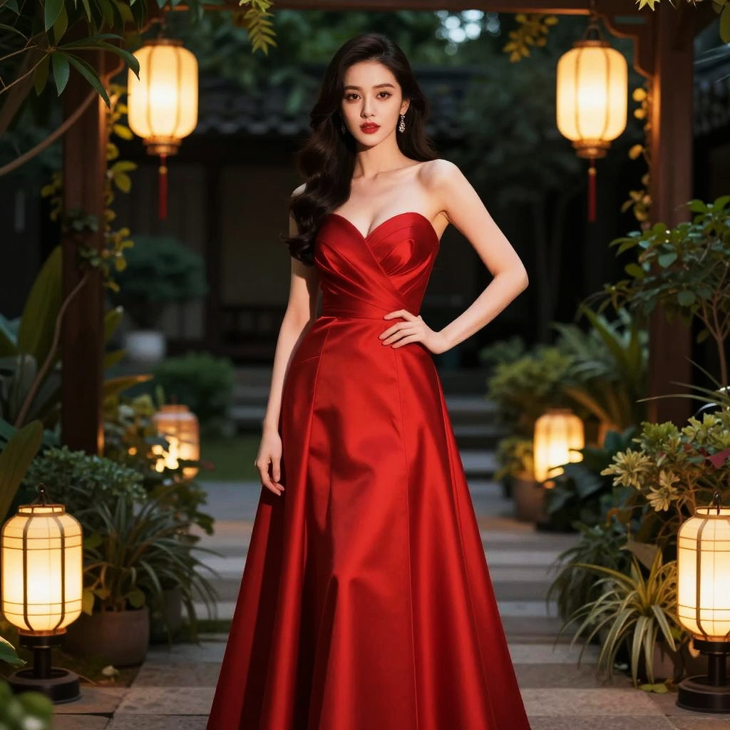 A young Asian woman standing gracefully outdoors wearing a flowing white off-shoulder wedding dress with elegant pleats and a sweetheart neckline. She accessorizes with a dazzling statement necklace and matching earrings. The natural backdrop includes a tree and lush greenery under soft natural lighting, creating a romantic atmosphere.