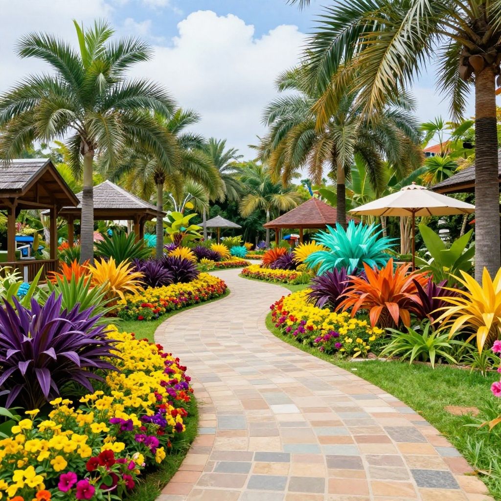 A brightly colored tropical garden featuring a winding stone pathway surrounded by lush, vibrant flowers and various types of palm trees. The garden includes ornamental plants in multiple colors including purple, yellow, orange, and turquoise, with a sunny sky and a peaceful atmosphere. Small gazebos or garden structures and parasols enhance the serene garden setting.