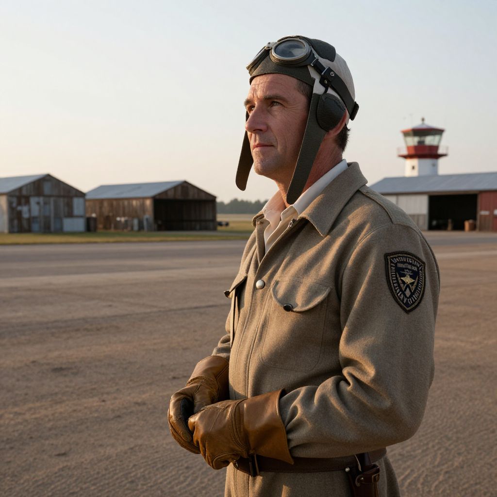 A realistic photograph of a middle-aged man in an old-time pilot costume, wearing a vintage flying suit with a white pilot cap, leather gloves, and a large pilot’s patch on the sleeve, standing on a dusty airport tarmac at sunrise, with weathered wooden hangars and a red-and-white control tower in the background, his face has a weathered, kind eyes with a slightly weathered look, looking out over the horizon.