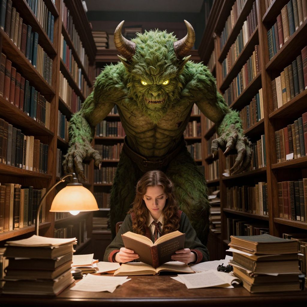 Intriguingly juxtaposed, a towering green monster with glowing eyes and horns looms menacingly above a scholarly woman engrossed in reading amidst a labyrinthine library filled with towering wooden shelves brimming with ancient books, while warm lamplight illuminates her desk cluttered with stacks of manuscripts and open texts.