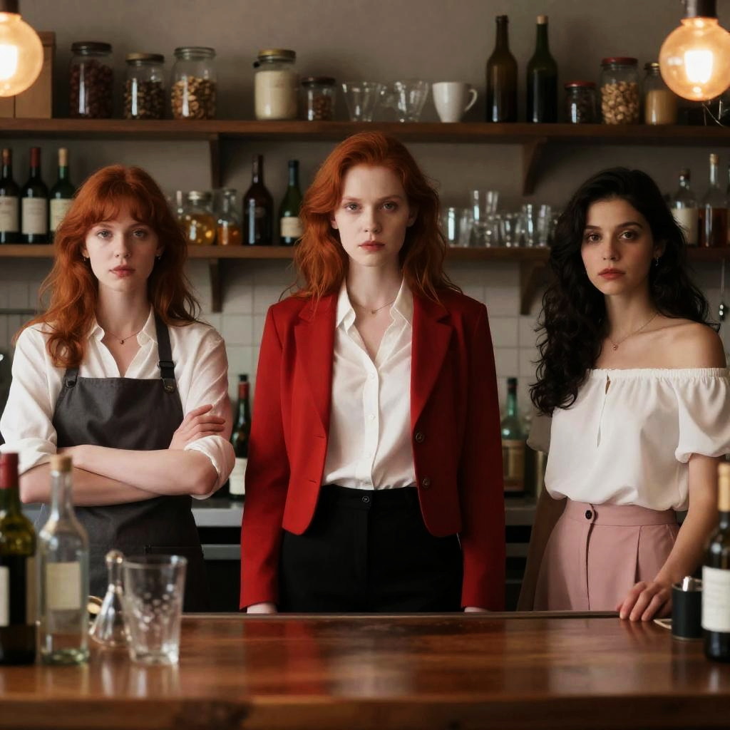 Photograph of three women in a retro diner. Woman on left stands behind counter, pale pink dress, curly brown hair. Woman in center sits at table, white blouse, pink skirt, brown hair, holding book. Woman on right stands, pink floral dress, curly red hair, holding wine glass. Background: shelves with framed pictures, bottles, and decor. Red chairs, diner counter, cluttered table with clothes. Soft, nostalgic lighting.