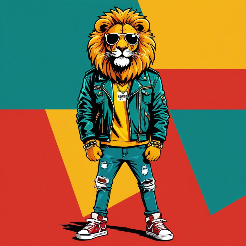 A vibrant, cartoon-style illustration of a lion character standing against a solid, brightly-colored background. The character is wearing a stylish outfit that includes a leather jacket, ripped jeans, sneakers, and unique accessories such as aviator sunglasses, studded bracelet. The illustration features bold outlines, bright, contrasting colors, and a playful, slightly retro or hip-hop vibe. The character’s pose is relaxed and expressive, giving them a cool and confident look. Use a color palette with golden yellow, deep teal, crimson red for the background and outfit. The art style is modern and slightly abstract, with exaggerated proportions and playful details.