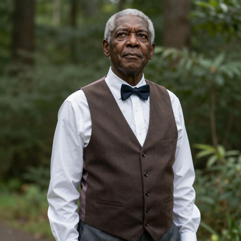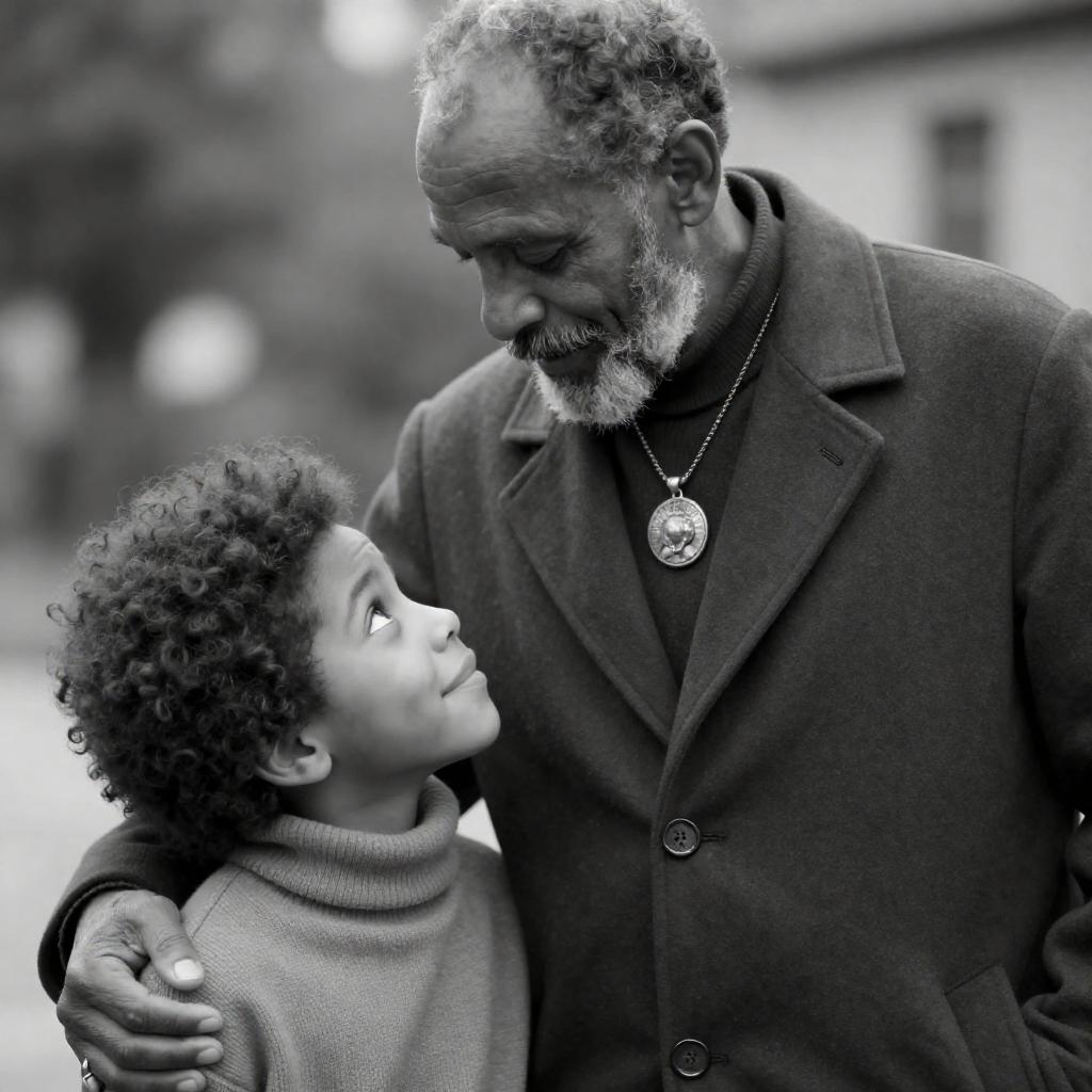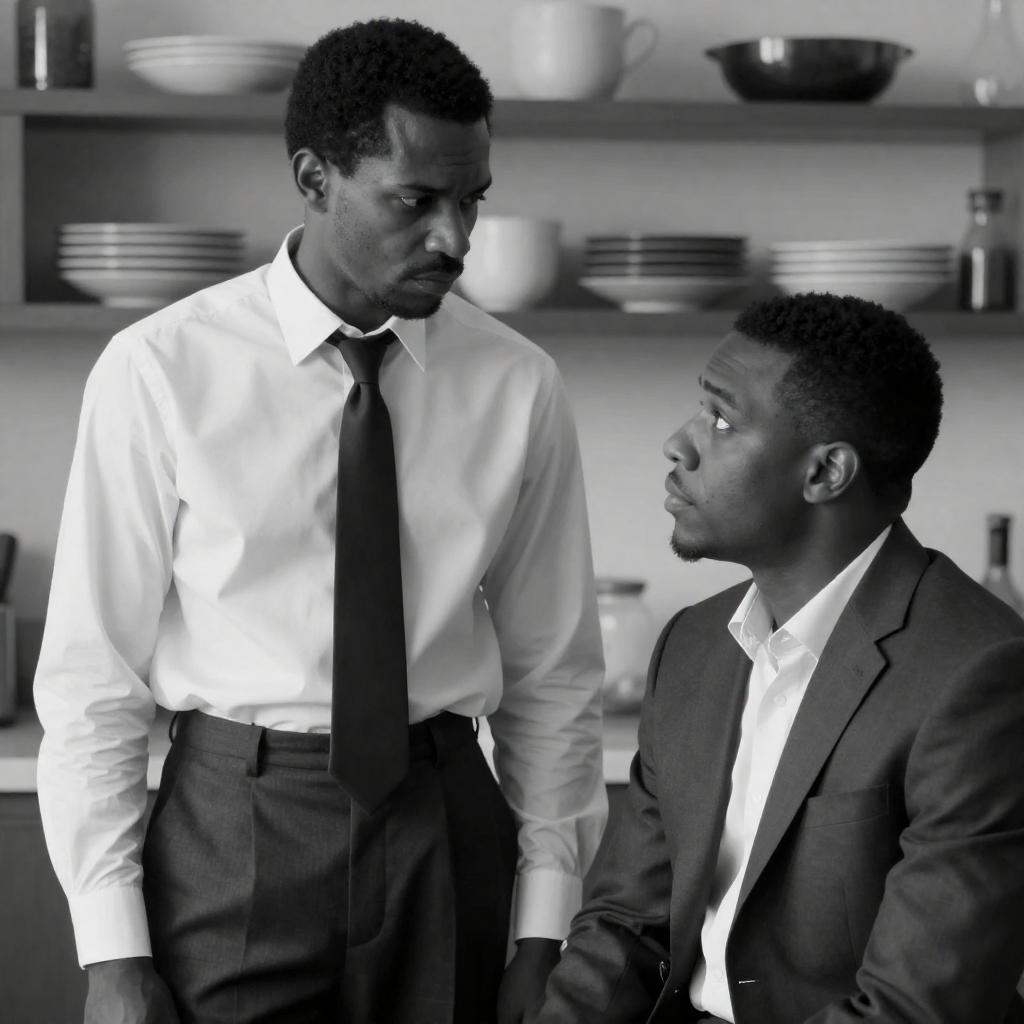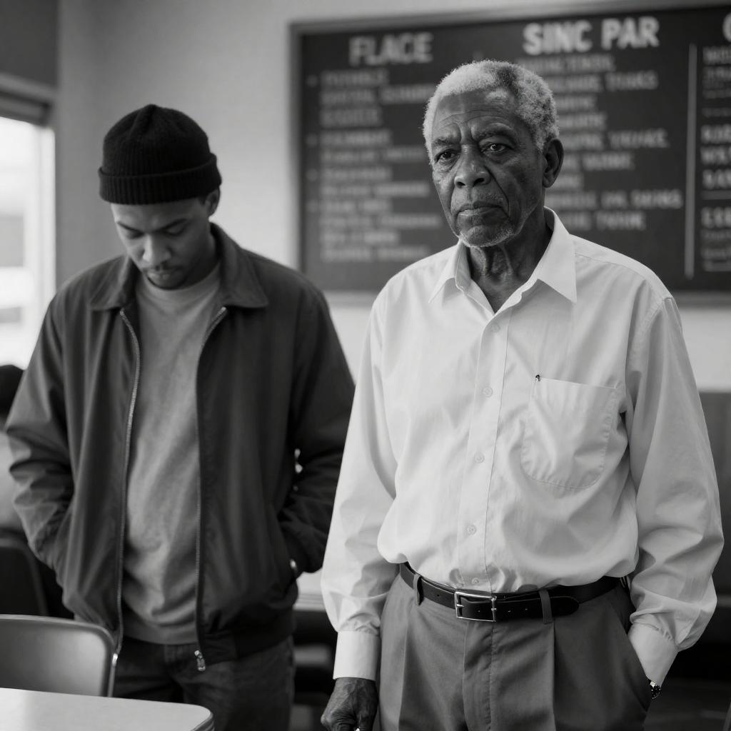 Black and white photograph of two African American men in a diner. Older man in light shirt and pants, standing with a serious expression, holds a cigarette. Younger man in dark jacket and beanie, looks down. Chalkboard menu in background.
