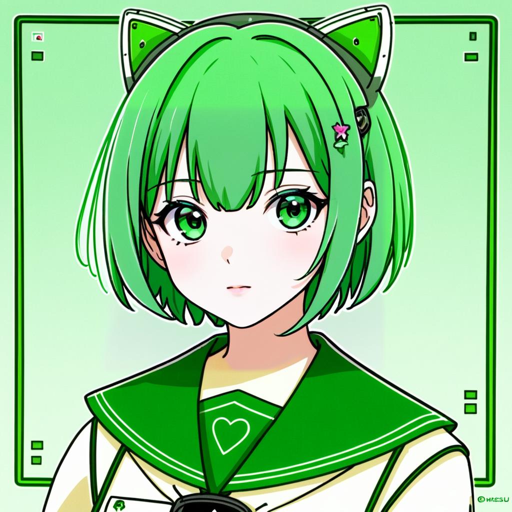 Illustration of an anime-style girl with short green hair and bright green eyes wearing a green and navy blue Japanese school uniform (serafuku). She has white robotic headphones resembling robot ears and features a heart motif on her outfit. The art style is digital anime with a futuristic, android theme set against a green geometric background.