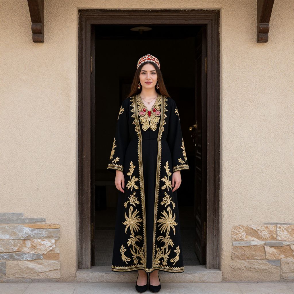 Traditional Turkish Costume, woman in a traditional dress standing in front of a doorway