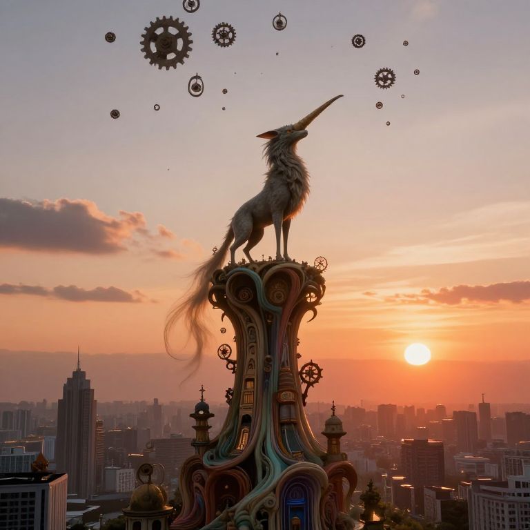 In the surrealistic spirit, portray an enigmatic dreamscape where a majestic mythical creature stands atop a whimsical tower made of flowing architecture, its awe-inspiring horn reaching into the sky filled with floating objects reminiscent of gears and pendulums. The scene is illuminated by the warm hues of a sunsetting day, casting an air of enchantment and agelessness as the ethereal being looks down upon a vibrant cityscape below, seamlessly merging elements of fantasy and reality to provoke contemplation on the nature of space and time.