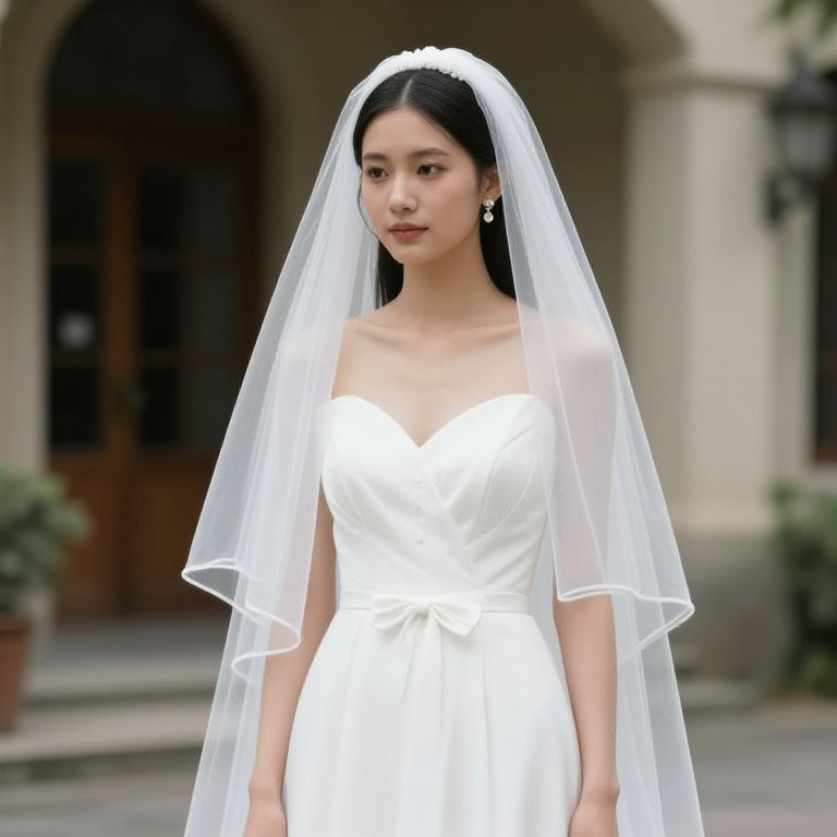 Photograph of a young woman with fair skin, dark brown hair, wearing a white long-sleeve dress, sheer white veil, and black knee