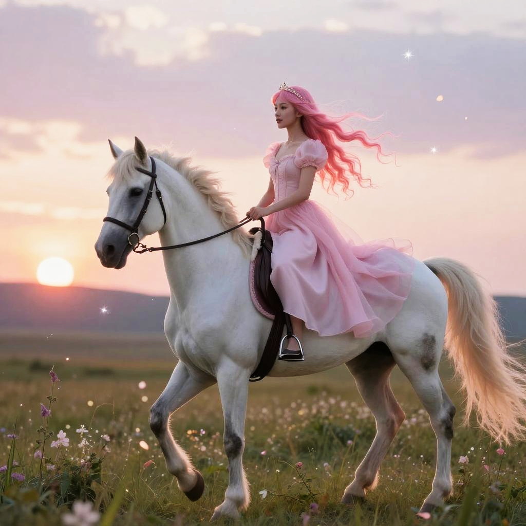 Pink hair princess riding a white unicorn across a mystical meadow under a sunset sky, her hair glowing softly, ethereal atmosphere with magical sparkles and floating petals