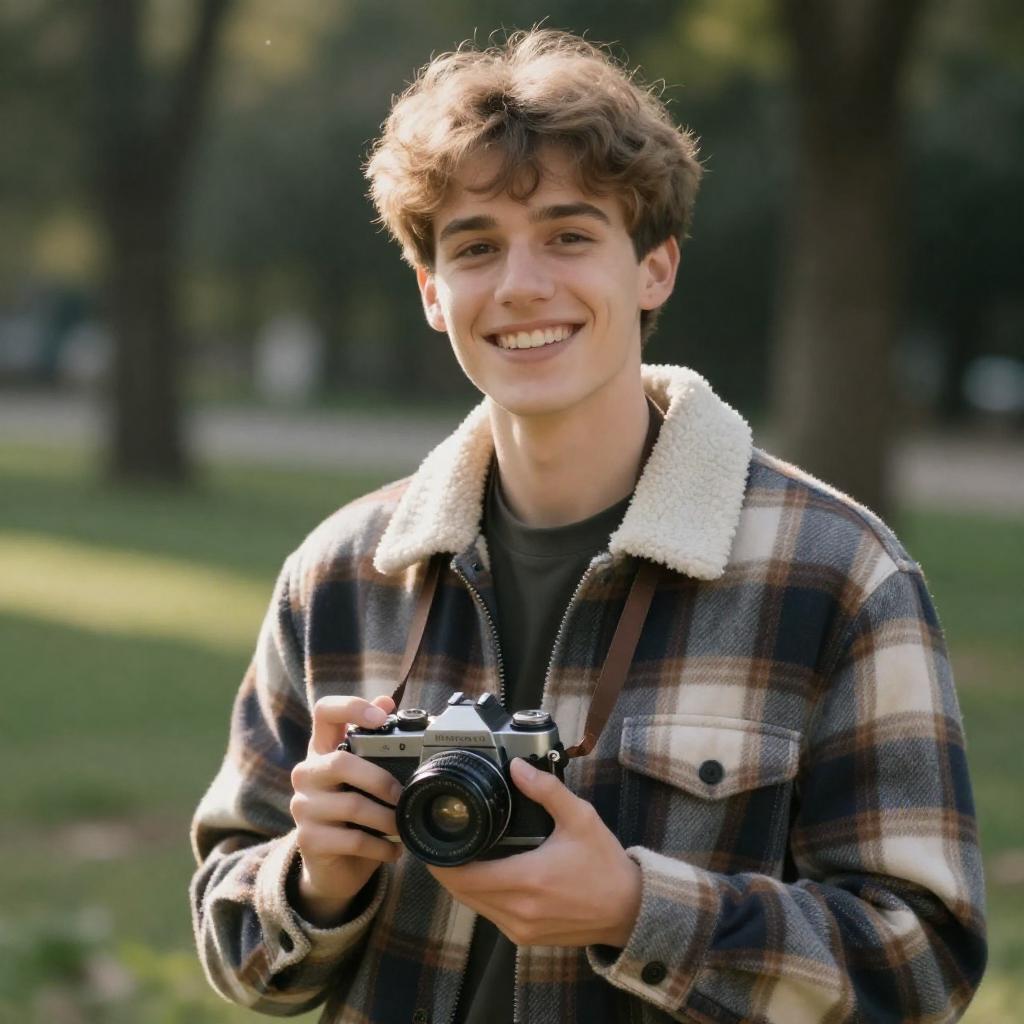 Photograph of a young man with medium-length brown hair, smiling broadly. He wears a dark green jacket over a navy blue shirt with a yellow tree graphic. The background is blurred greenery. His hands rest on a wooden surface in front of him. Bright sunlight highlights his face, creating a cheerful and relaxed atmosphere.