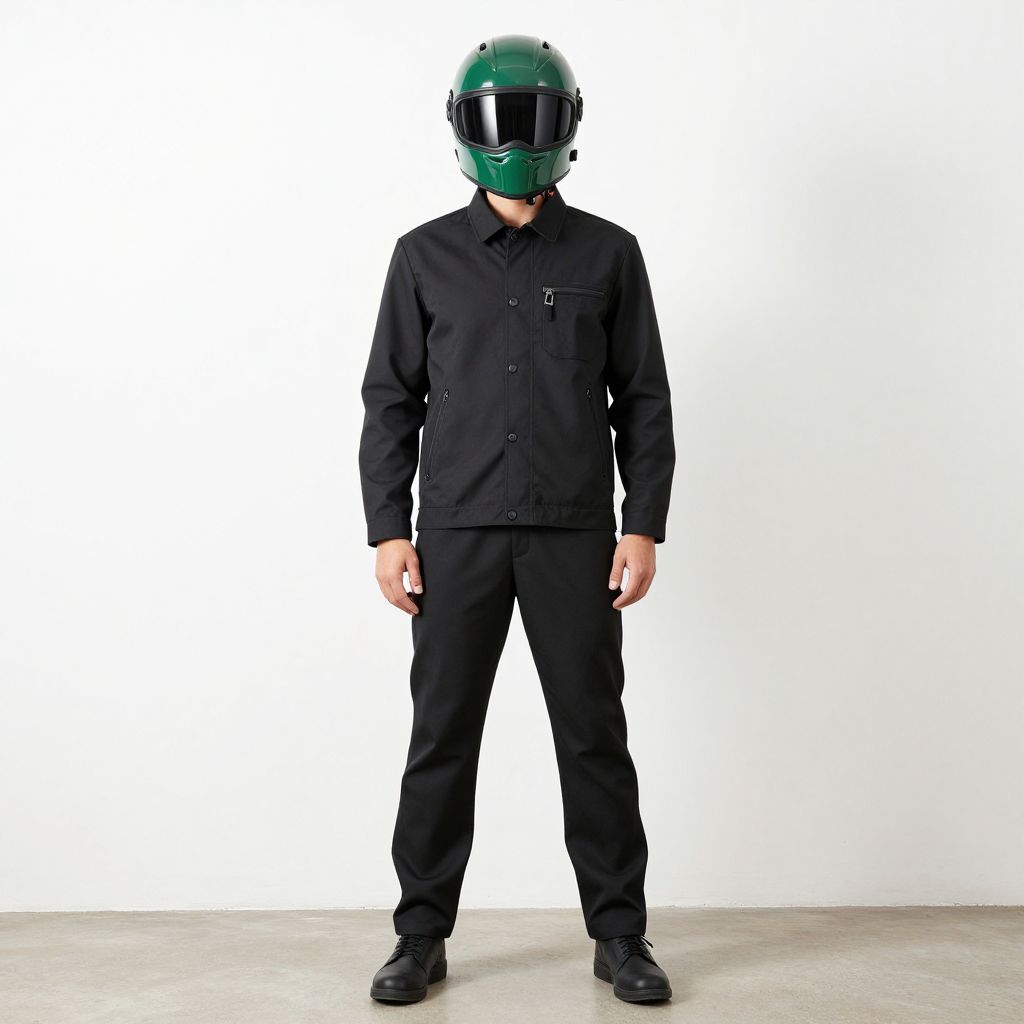 Photograph of a man standing against a plain white background. He is wearing a black, long-sleeve, button-up jacket with pockets on the chest and black pants. His head is covered by a green, matte-finished, full-face helmet with a dark-tinted visor, obscuring his face. He has black shoes with laces. The man stands with his arms relaxed at his sides, feet slightly apart, and gazes directly at the camera. The floor is a smooth, light gray concrete. The image has a clean, minimalist style with high contrast and sharp focus.
