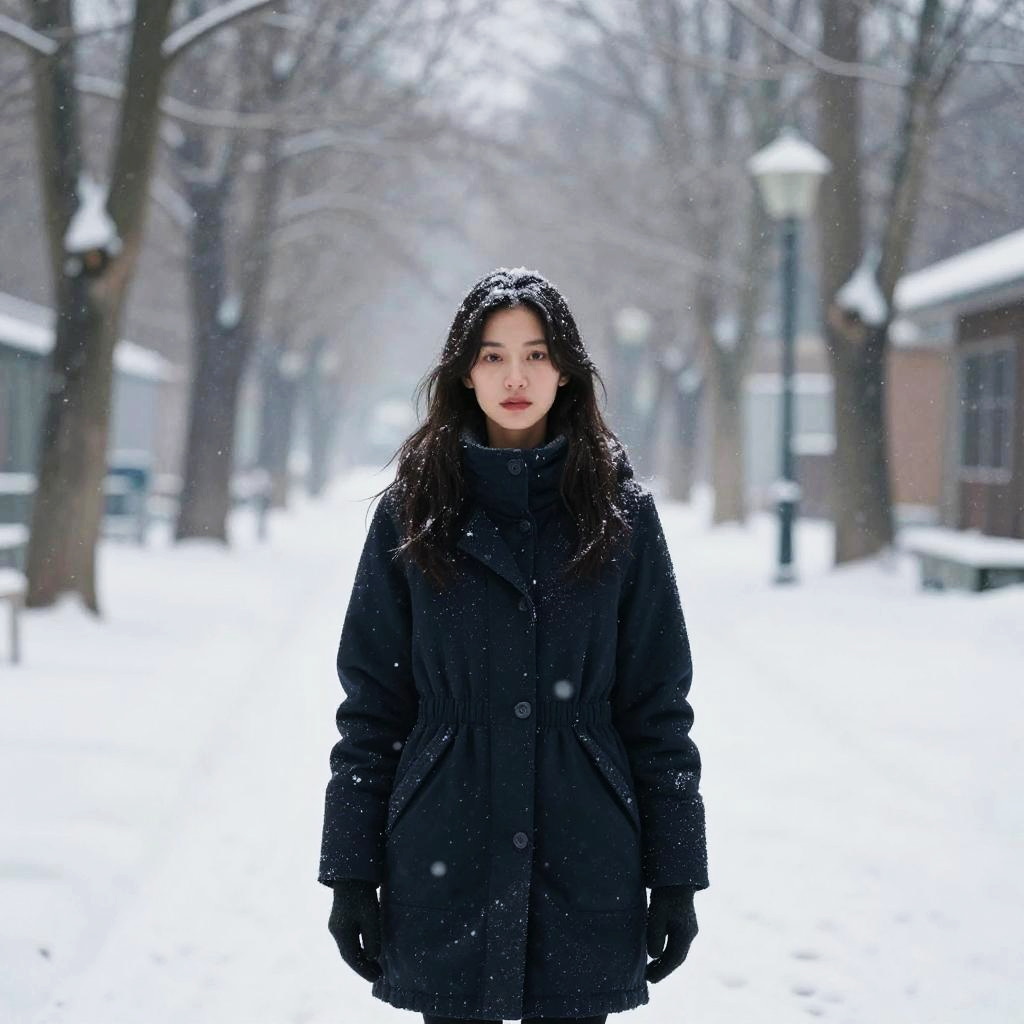 Photograph of an Asian woman standing in a snowy, tree-lined urban park. She has long, dark hair, and is wearing a black, puffy winter coat with a high collar and black gloves. Snowflakes are falling around her, and her expression is neutral. The background is blurred, featuring bare trees, street lamps, and buildings partially covered in snow. The overall color palette is predominantly white and black, with a stark contrast between her dark coat and the bright snow. The image has a slightly overexposed, ethereal quality due to the falling snow and bright white ground.
