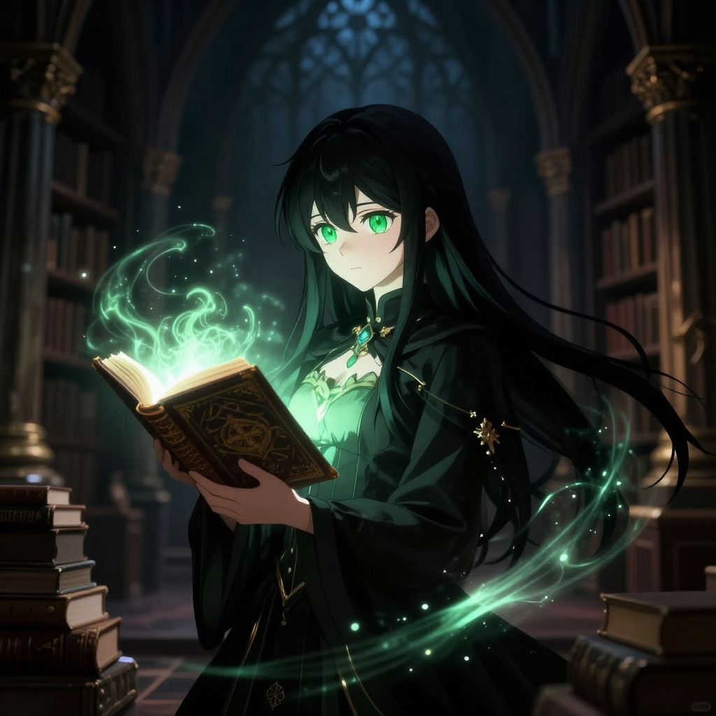 Black hair green eyes anime girl as a magical sorceress in a dark enchanted library, glowing spellbook in hand, swirling magical energy around her, gothic architecture and ancient tomes, moody lighting with detailed character and mystical atmosphere.