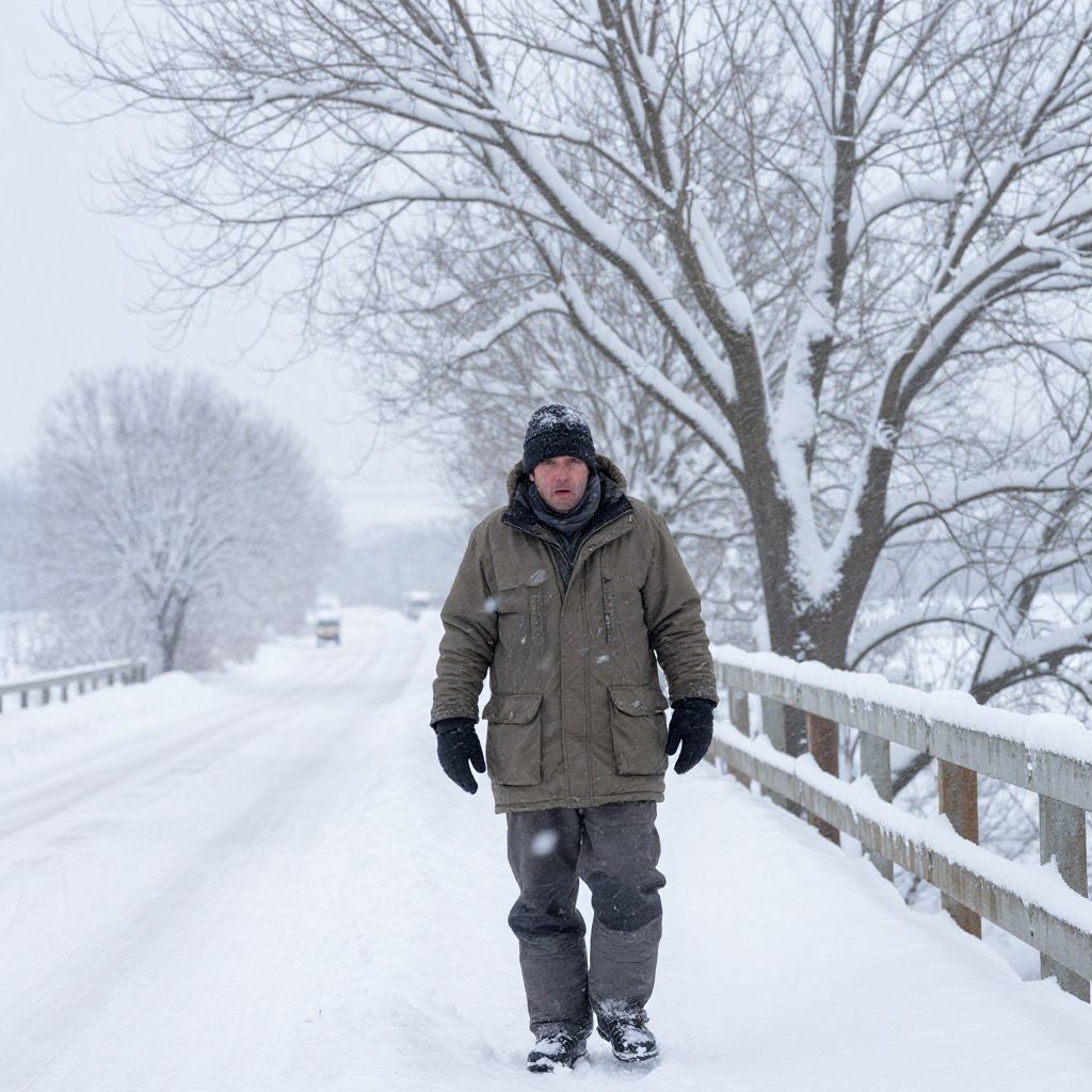 A stark, high-resolution image of a rural snowy road during a blizzard, with strong wind gusts visible in ripples of snow, a rugged man in a heavy parka and beanie standing on a bridge above the road, his face weathered and expression determined, with trees bowed under the weight of snow.