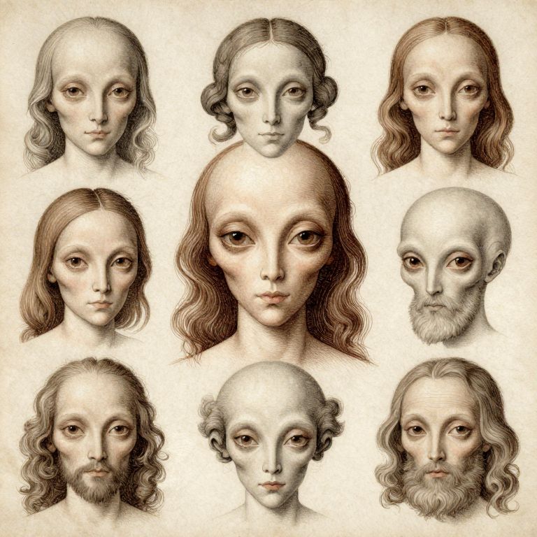 The image presents a highly detailed sheet of the Roschard test, featuring a collection of alien faces in the distinctive style of Leonardo da Vinci. The faces are meticulously drawn with fine lines and shading, showcasing a variety of expressions and features. The central face is larger and more prominent, surrounded by eight smaller faces arranged in a grid-like pattern. The faces exhibit a range of textures, from smooth skin to detailed hair and beards, each rendered with a high level of precision. The overall composition is balanced, with the faces evenly distributed across the sheet, creating a harmonious and intricate visual experience. The background is a textured, aged parchment, adding to the historical and artistic feel of the image.
