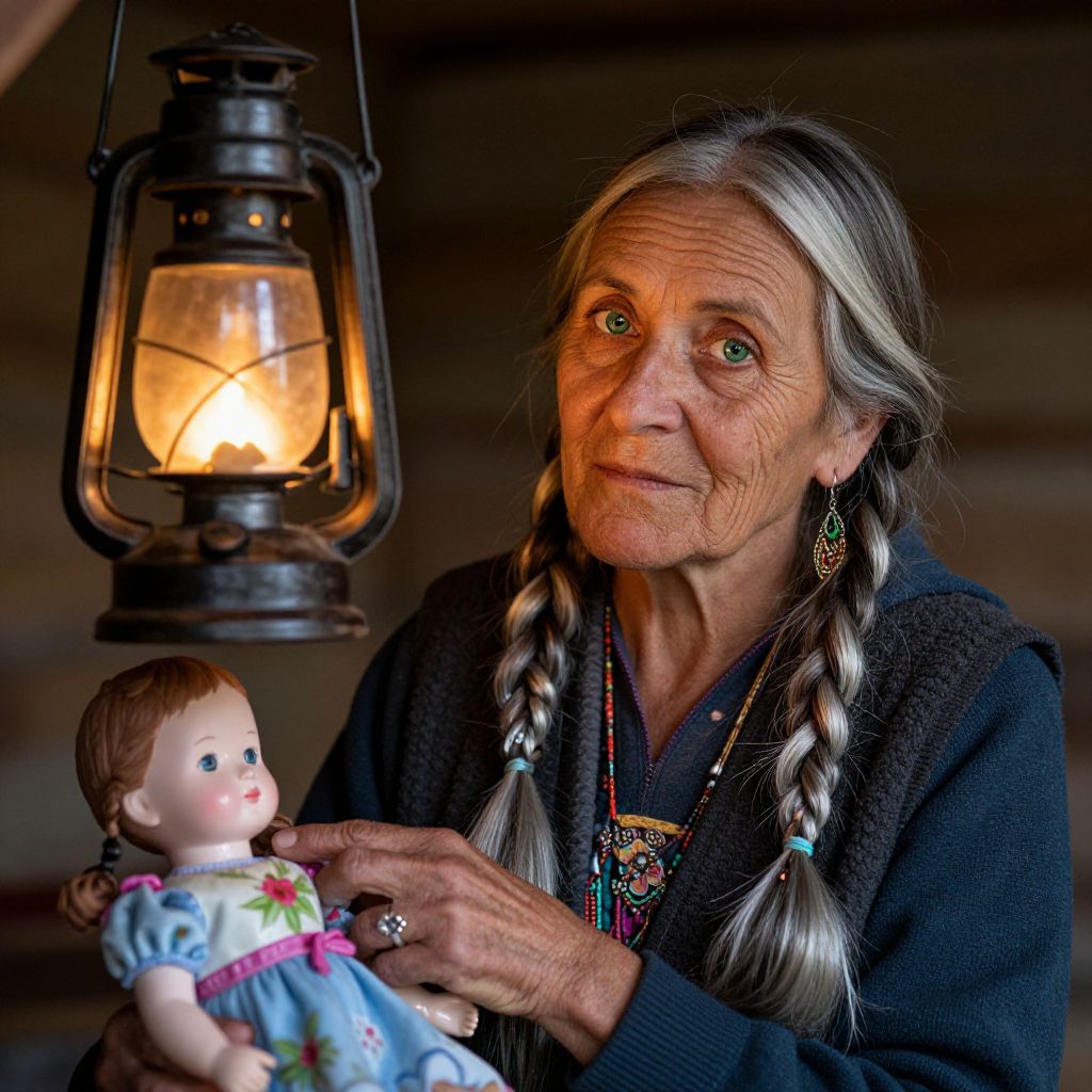 Photograph of an elderly Native American woman with long, braided gray hair, wearing a black sweater and beaded necklace, holding a porcelain doll dressed in a blue dress with a pink sash. Her expressive green eyes and weathered face show deep wrinkles. She gazes intently at the camera. A black, glowing lantern hangs in the dark, rustic background. The doll's face is rosy with brown hair, and she has a calm expression. The woman's hands, adorned with rings, gently hold the doll's waist. The warm light from the lantern illuminates her face and the doll.