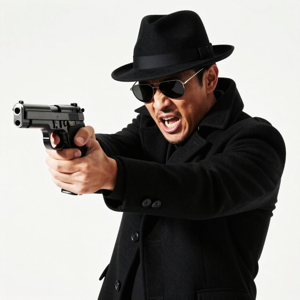 Photograph of a man with a light skin tone, wearing a black bowler hat, round sunglasses, and a black suit. He's holding a silver revolver in his right hand, pointed upwards. His expression is serious, and he's set against a plain white background with gray borders on both sides. The overall style is reminiscent of a classic film noir.