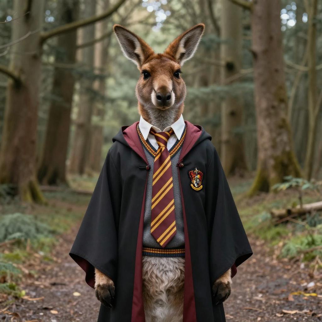 A kangaroo dressed in a Gryffindor-themed outfit from the Harry Potter series, including a tie, sweater, and robe, standing on a forest path with sunlight filtering through tall trees in the background.