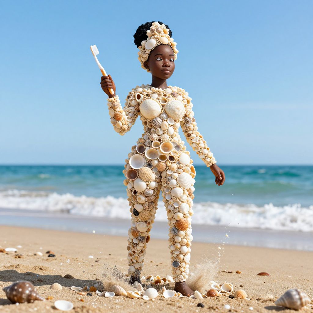 Toothbrush Splatter A full body long shot of a beautiful seashell woman made entirely out of seashells, standing on a beach, African Woman facial features, HDR, 64k,
