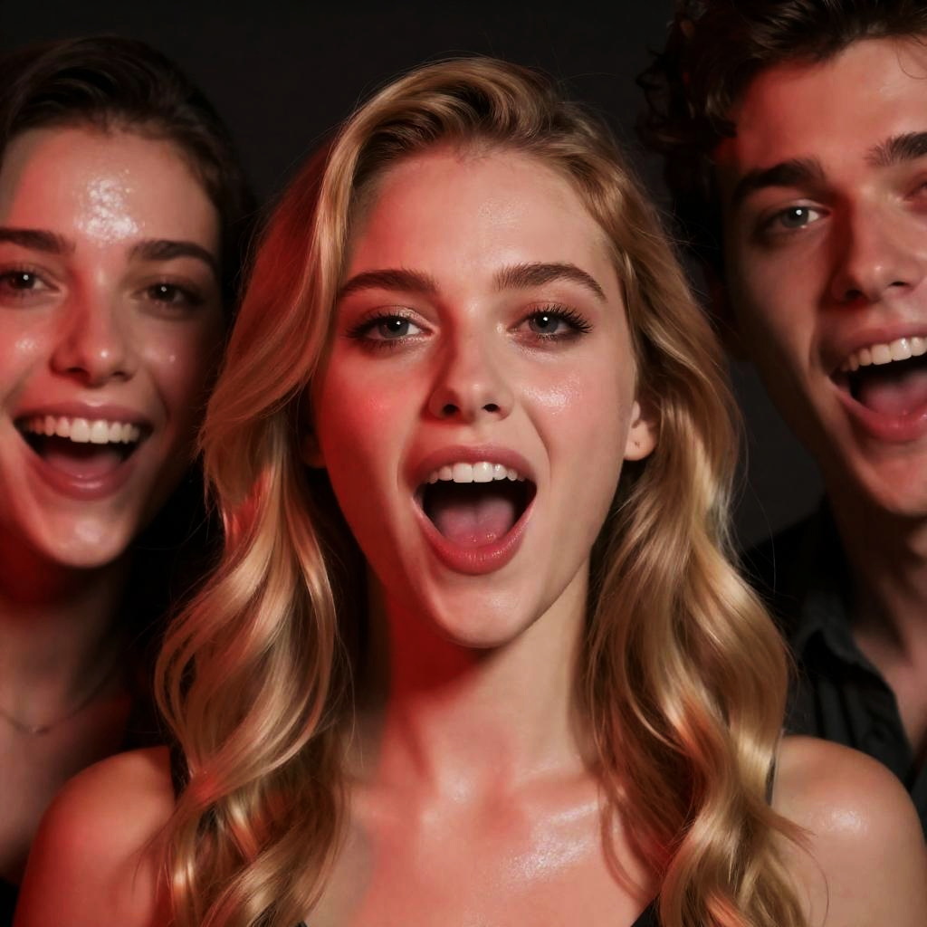 Close-up photograph of a blonde woman with closed eyes, mouth open, showing a large fly in her mouth. A hand holds her head from the left. Background includes blurred objects and people. Two people in blue and white clothing are partially visible on the right and left.