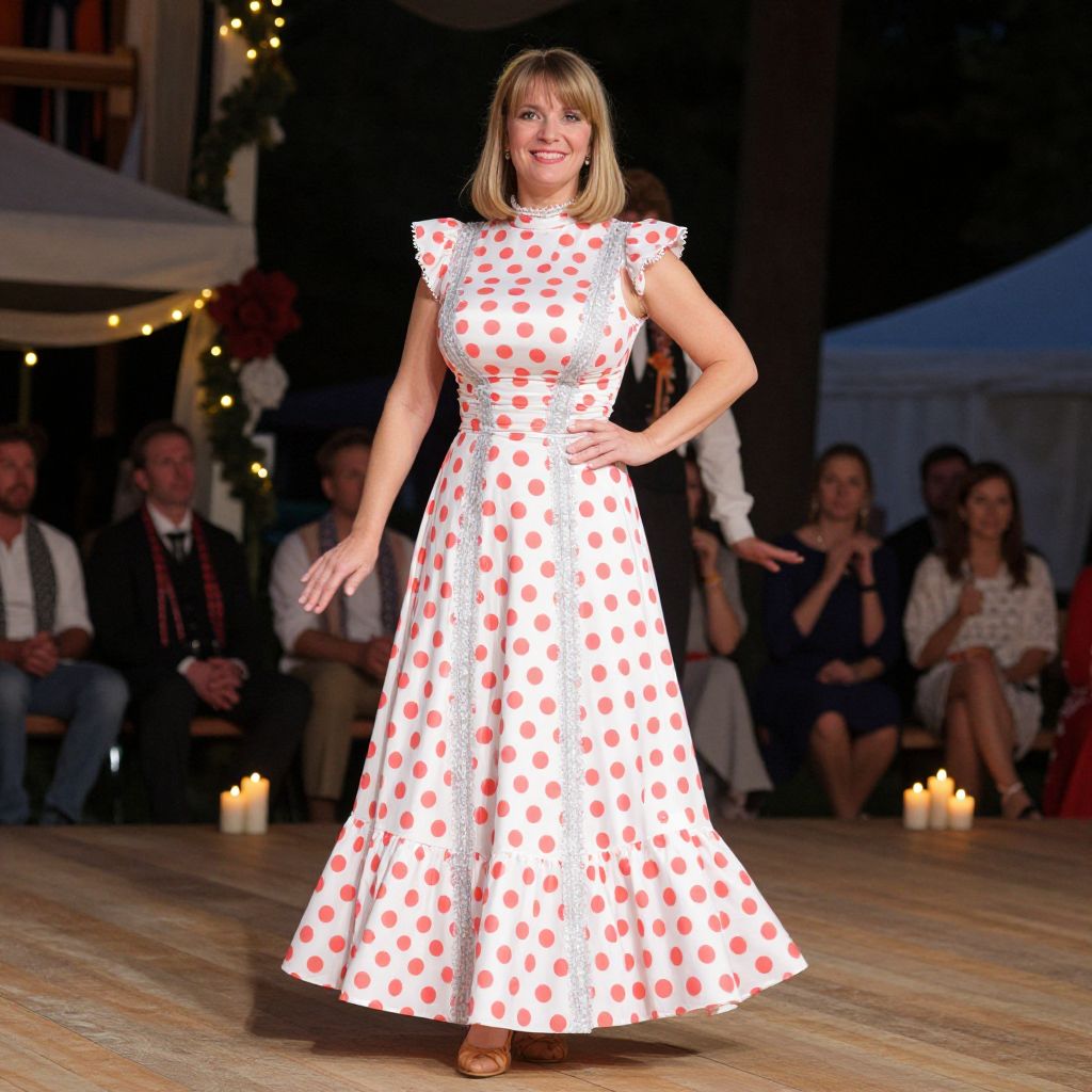 A stylish woman in her early 40s with soft blonde hair, almond-shaped eyes, and a warm smile is performing on stage in a formal yet fun polka dot dance costume. The costume is a white and coral polka dot floor-length dress with a high neckline and silver lace trim. She is on a rustic wooden stage at a cultural festival with candlelit ambiance and a soft breeze blowing through the audience.. The woman has big tits and cute face