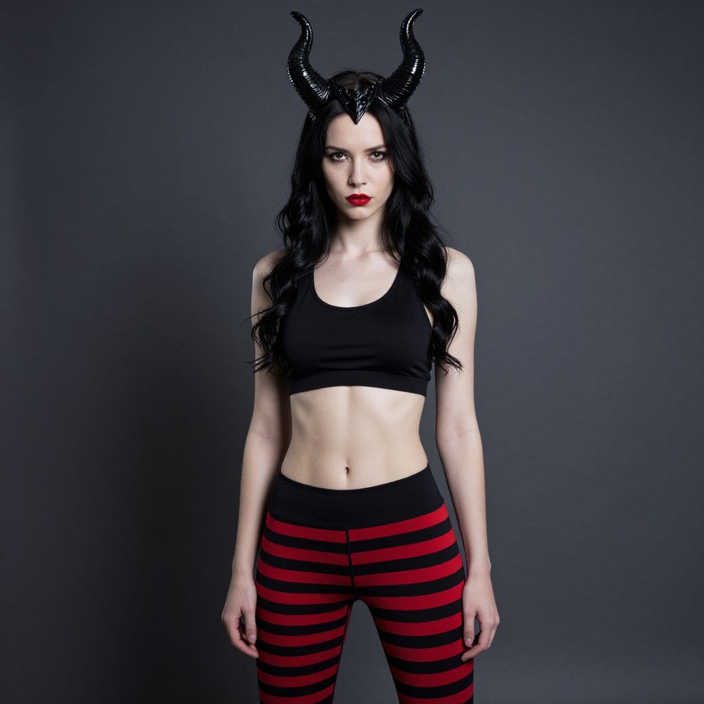 Photograph of a slender woman with pale skin and long, wavy black hair. She's wearing black horned headpiece, black sports bra, and red and black striped leggings. She's standing confidently against a dark gray studio background. Her red lips and serious expression add a touch of intensity. The lighting creates subtle shadows, highlighting her fit physique and stylish outfit.