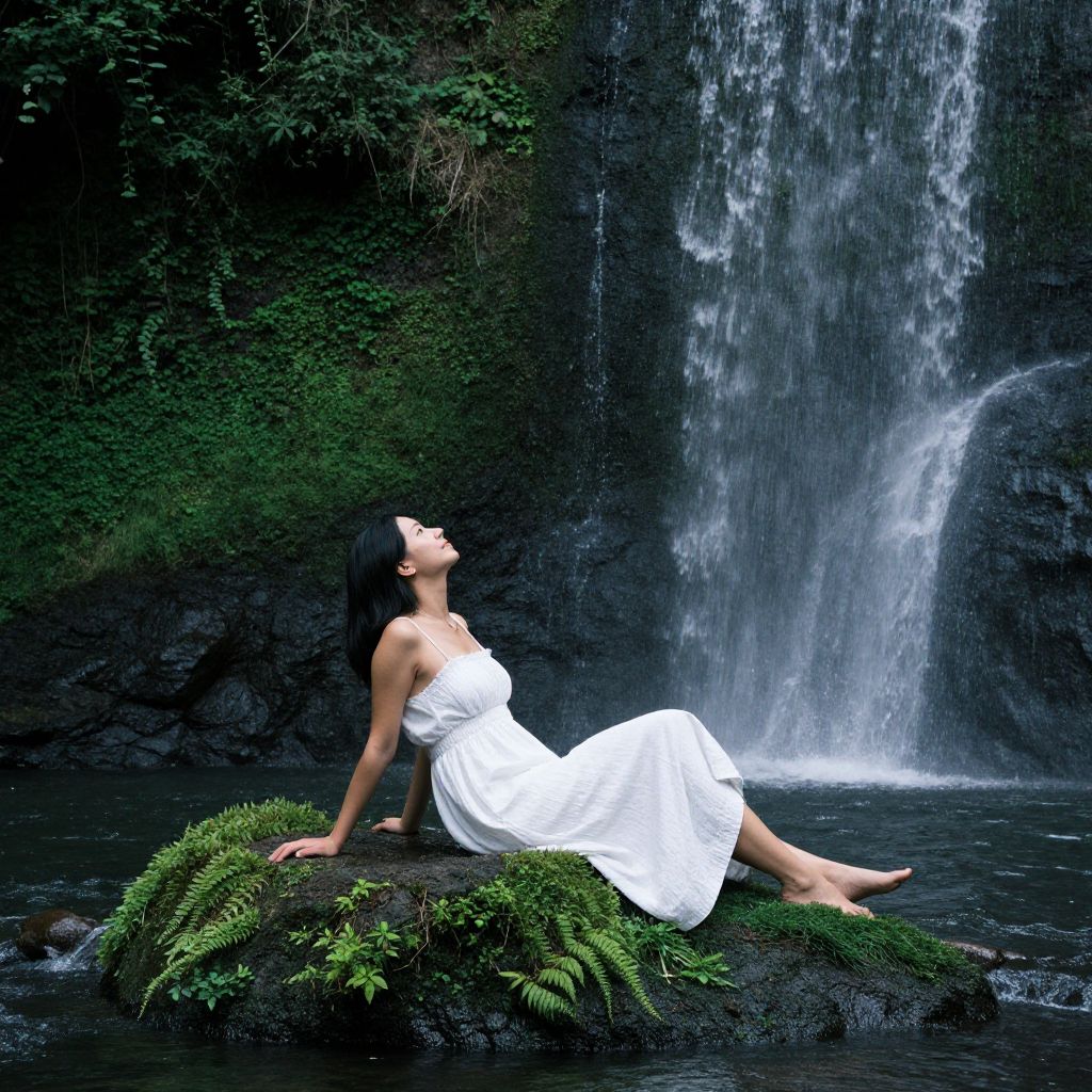 London Family Photographer, a woman in a white dress sits relaxing near a lush green waterfall setting