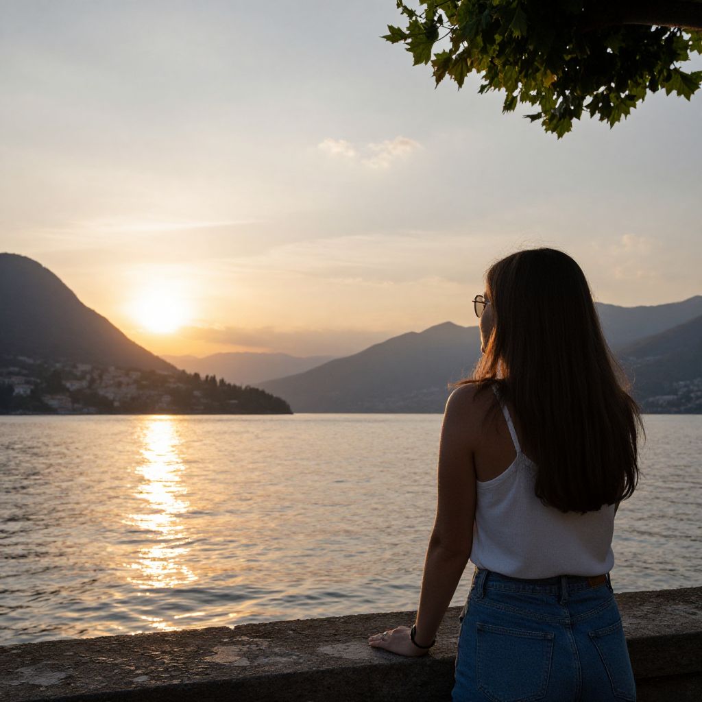 A woman watches the sunset on Lake Como, Italy
