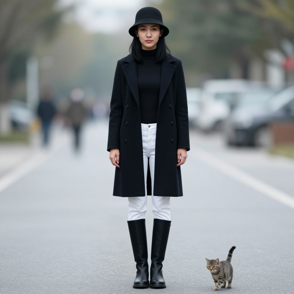 "huggy wuggy costume, solo, boots, red footwear, black hair, 1girl, full body, scarf, standing, outdoors, pants, gloves, short hair, looking at viewer, blurry, realistic Realistic photo of casual sexy person with pretty face"