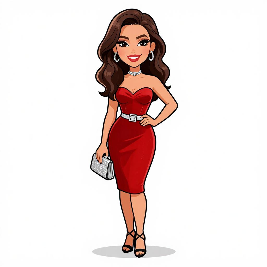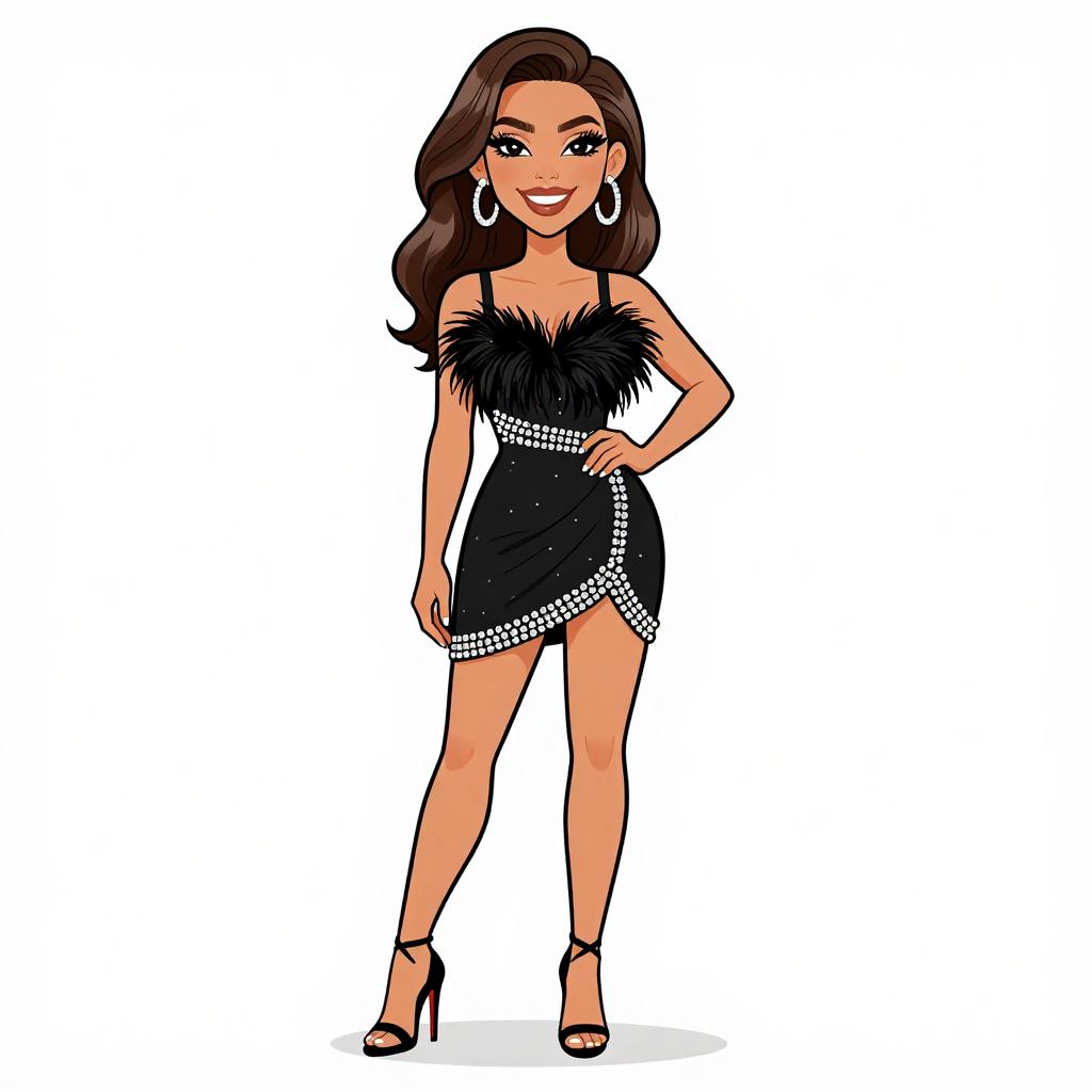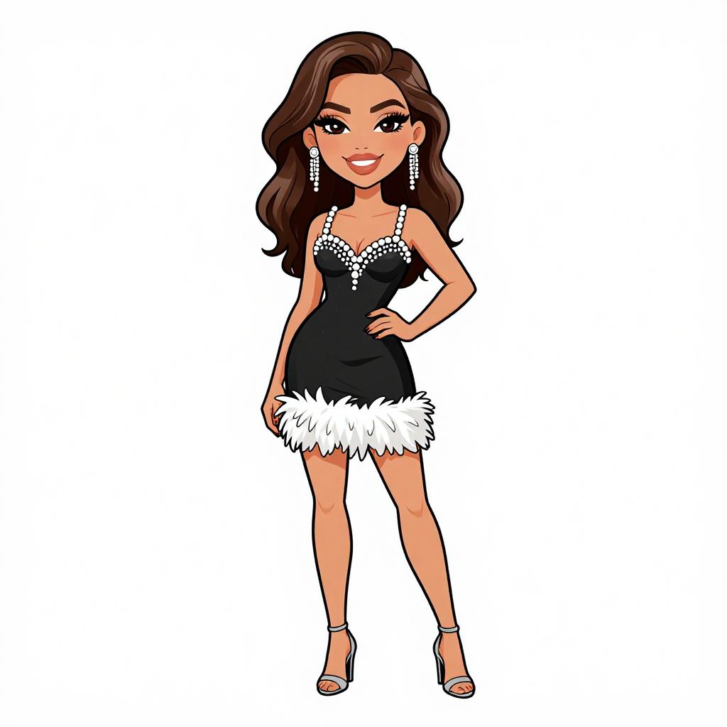 Woman with pretty face and pretty hair. smiling Woman, cocktail chic, black mini dress with a sweetheart neckline, embellished with white pearls and rhinestones, form-fitting, thin shoulder straps, skirt hem with feather-like white fringe details, silver strappy high heels, long dangling silver and rhinestone earrings, white background. --sref 1467