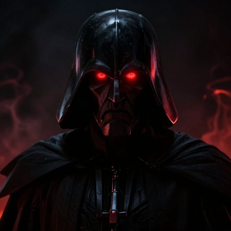 Portrait of a dark Sith Lord with glowing Sith eyes shining vividly red, contrasted against a stark black background with subtle hints of fire and smoke, highlighting the raw energy of the eyes and the character's sinister presence.